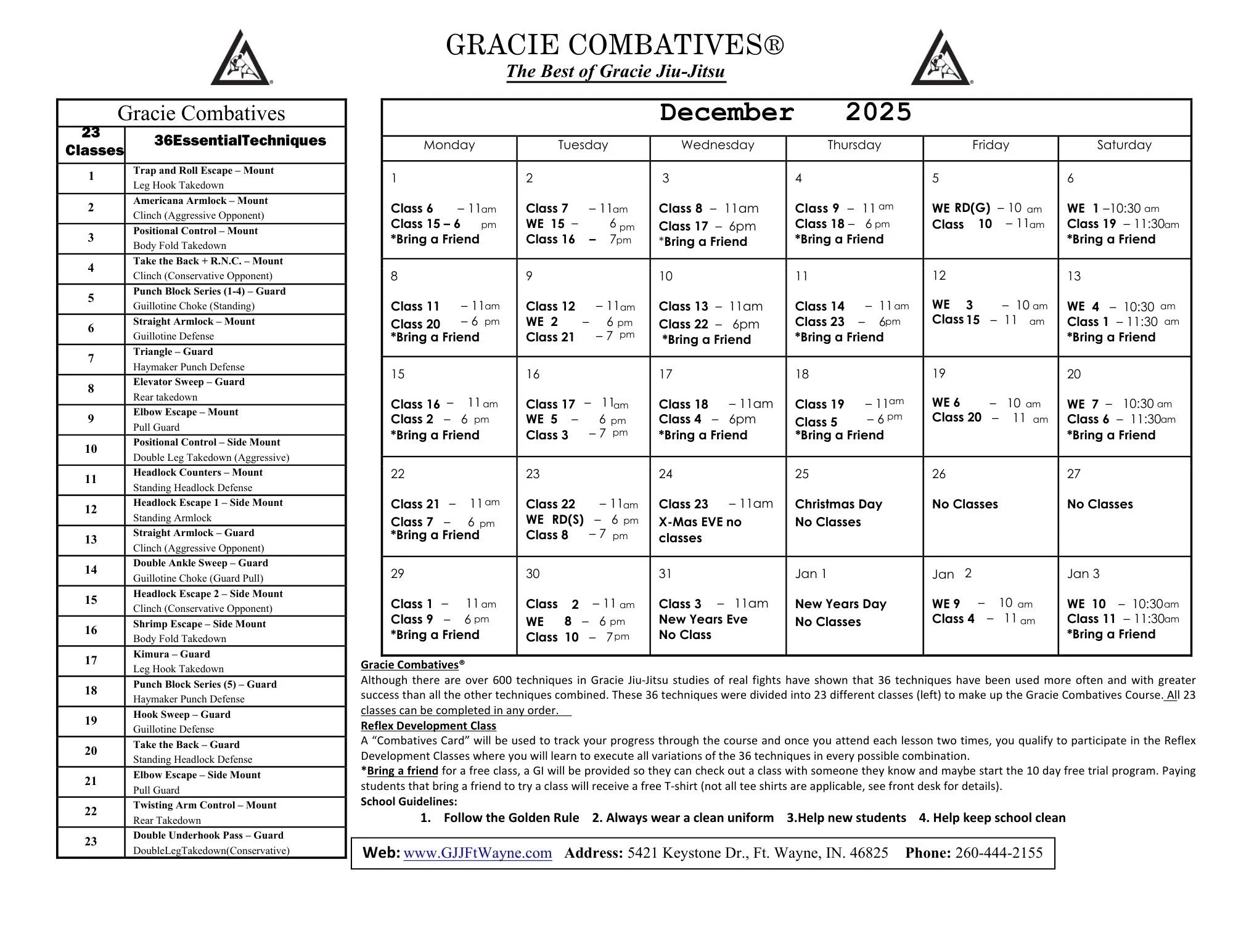 Gracie Combatives schedule DECember 2025